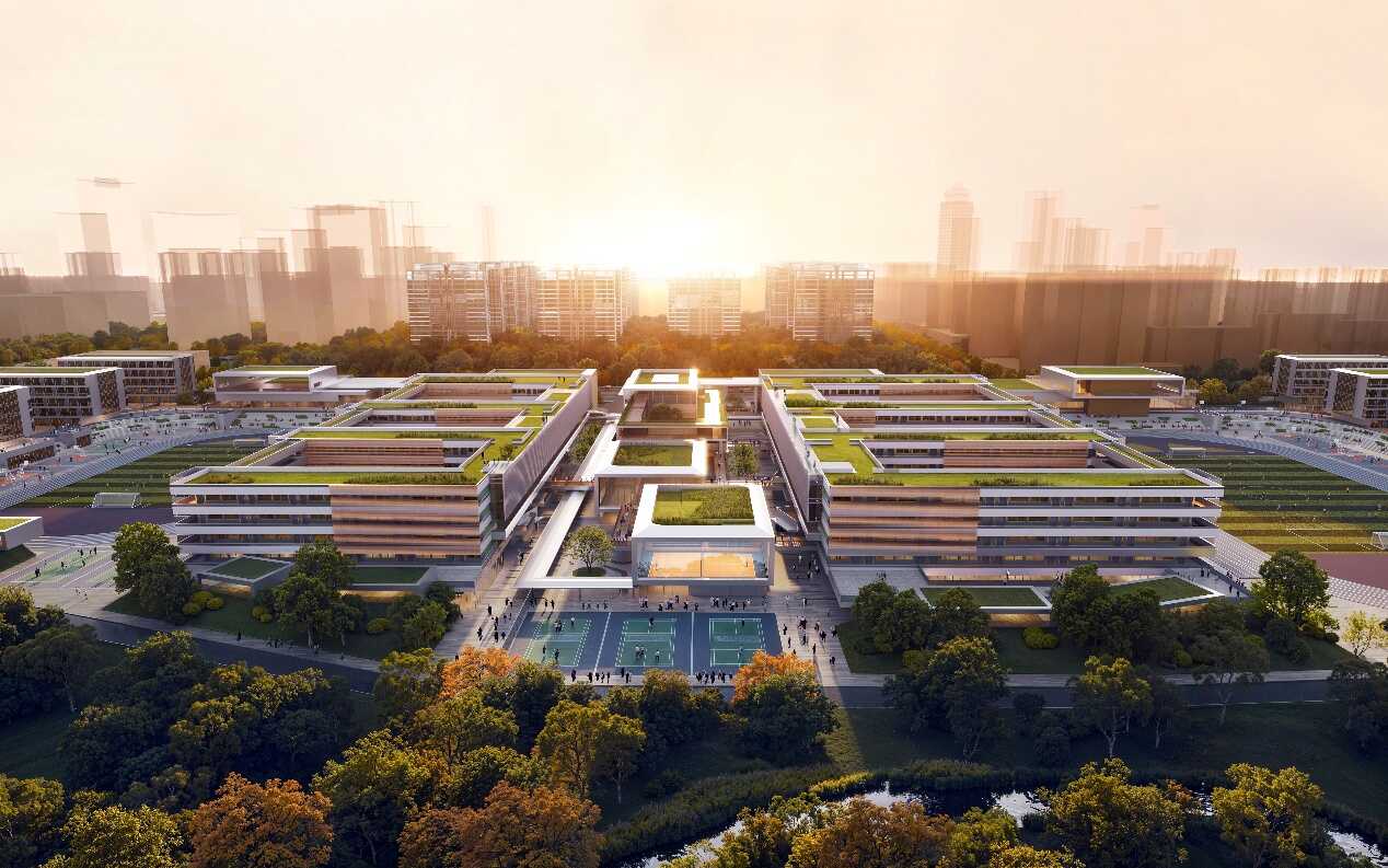 該項目位于杭州市西湖區,總建面約16.2萬平方米,包含2棟共享功能空間,風雨操場,報告廳及圖書館;9棟教學功能空間,行政樓,教學樓,實驗樓,專業教室等;8棟生活功能空間,學生宿舍,教師宿舍,食堂等。項目以“文樞學環”為核心設計理念,旨在構建一個多維文化相互共生、交融的未來教育場景。設計尊重并延續城市肌理,從城市關系、生態延續、教學效率與空間活力等多個維度展開,形成“觀山、臨水、望洲、見村、眺田”的空間秩序與景觀畫卷。通過強化城市維度的展示與運營、推動生態體系的延續與營造、保障教學空間的獨立與高效、促進活力場景的多元實踐,最終實現“文樞學環”的構建。項目建成后將為當地教育資源注入新活力。