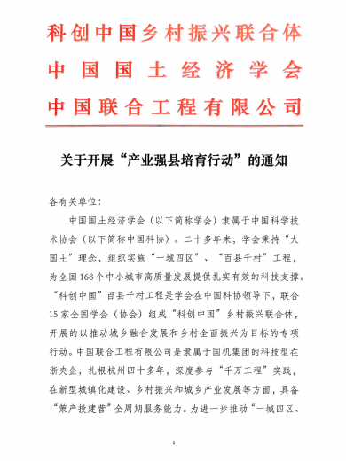 近日,“科創(chuàng)中國”鄉(xiāng)村振興聯(lián)合體、中國國土經(jīng)濟學(xué)會、中國聯(lián)合工程有限公司聯(lián)合印發(fā)《關(guān)于開展“產(chǎn)業(yè)強縣培育行動”的通知》(以下簡稱《通知》),擬攜手相關(guān)單位共同推動“產(chǎn)業(yè)強縣培育行動”相關(guān)工作。